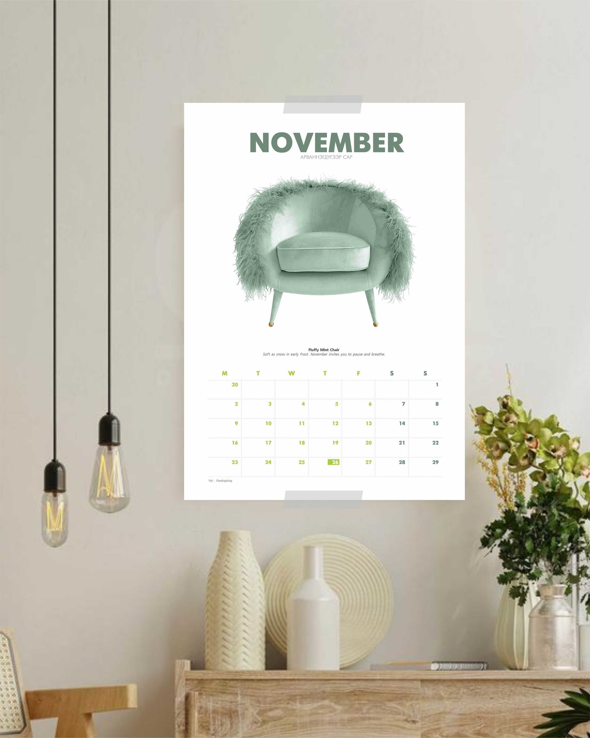 A calendar for comfort seekers and interior lovers. Each month pairs with a hand-picked designer chair in dreamy, cozy tones – adding an aesthetic touch to your wall while keeping your schedule on track.